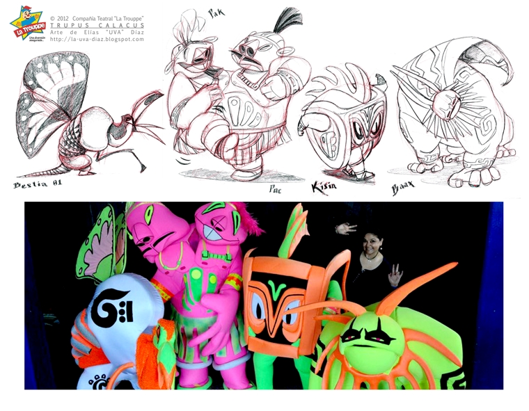 La Compañía Teatral "La Trouppe" lo hace de nuevo. Con 25 años en escena, esta compañía ha mantenido y elevado la calidad de producciones teatrales y de entretenimiento para niños en México. Esta vez (octubre, 2012), con el apoyo del gobierno de Xcaret y ganadora del estímulo Efiteatro, estrenaron la espectacular puesta en escena "TRUPUS CALACUS", dirigida por el veterano y talentoso Mauro Mendoza, sinónimo de diversión y elevados estándares de producción, en el Festival Vida y Muerte de Xcaret comprobando una vez más su rotundo éxito. Tuve la enorme fortuna de participar en esta hazaña de proporciones ultratúmbicas como DISEÑADOR DE PERSONAJES, TÍTERES Y VESTUARIO. Con más de 200 diseños y borradores, considero de mis experiencias más enriquecedoras y espléndidas en mi joven carrera. Aquí les comparto una pequeñísima parte de lo que hice con La Trouppe.